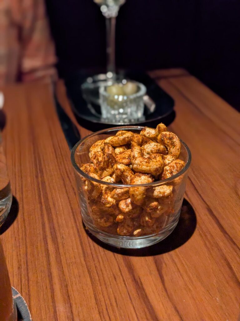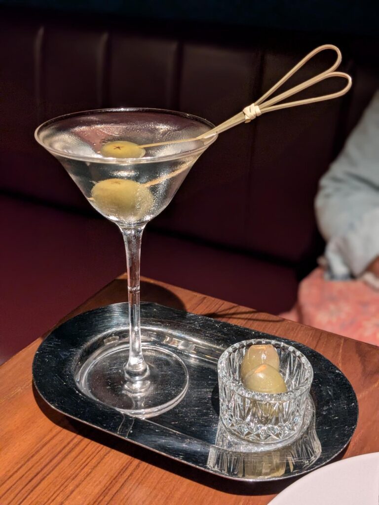 D had a 3 Gin Vesper which had gin heavyweights – Monkey 47, Tanqueray 10, Greater Than with Short Story vodka, Lillet Blanc, Dry Vermouth – which came frozen and poured straight from an icy bottle, served with blue cheese stuffed olive.