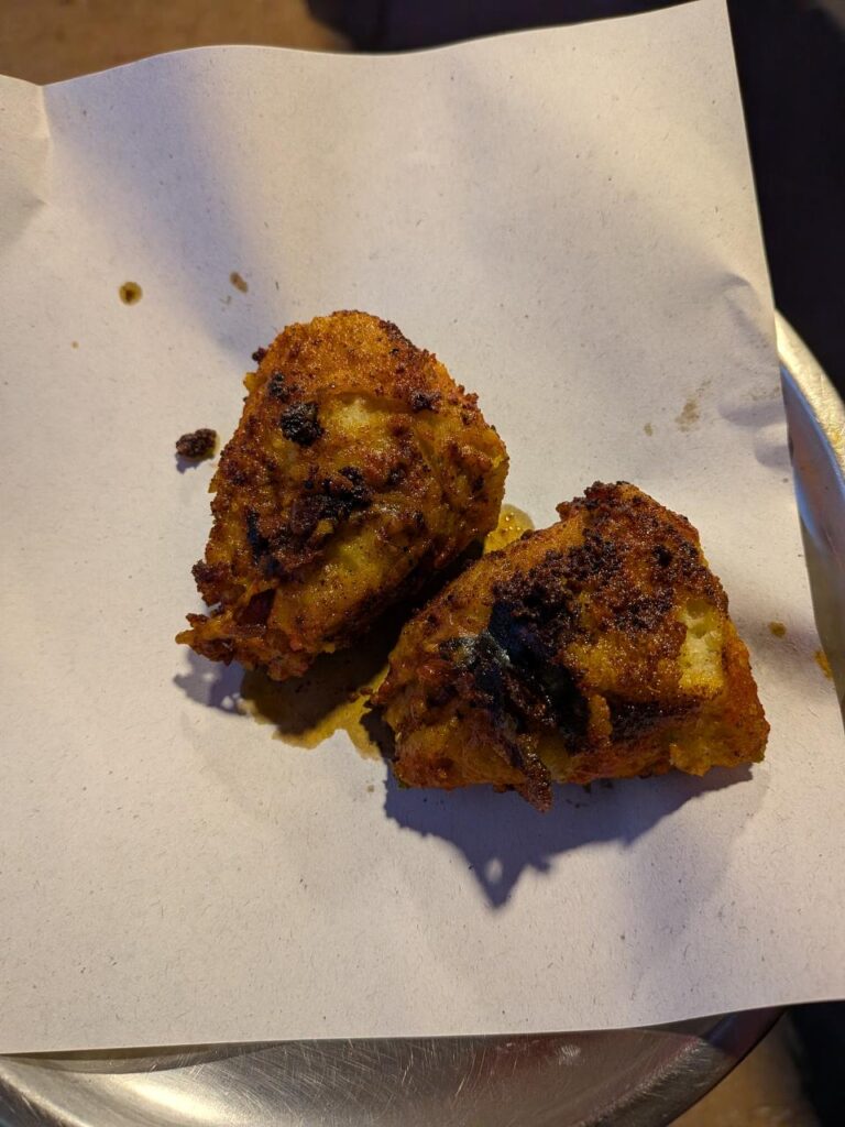 This is Kallumakkaya Nirachathu, which you can find on the roadside stalls very near Sunfun. Mussels, ground rice and spice, fried.