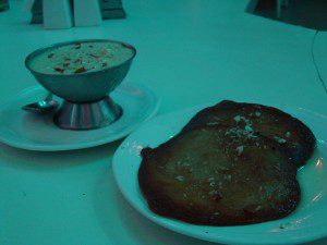 The plethora of choice continues in the main course too. And though the Mutton Kofta curry we wanted to try out wasn’t available, it turned out to be a blessing. The Gosht Nehari that was suggested to us instead turned out to be the best of the main course dishes with a silken rich gravy and well cooked meat. The Dum Aloo can be summed up with the fact that everyone approved of it until I smirked and told them that it was a Dum Aloo. Then everyone agreed that this wasn’t the way it was supposed to taste. Cheap thrills. The Murg Masala was mildly spicy and not a bad dish, but for a ‘special dish’, it wasn’t exceptional. There are some interesting options in the roti/naan section. The Baluchistan Kulcha with a kheema stuffing is definitely recommended as is the Harimirch ka Paratha, but you would want to stay away from the Channa Pudina ki Roti. The Gosht Dum Biryani was excellent – flavourful, non sticky rice and well cooked meat complemented by a reasonably good raita.